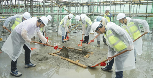 數(shù)月奮斗,翹首今日,出席人員手握系有紅綢的鐵鍬,將最后一方混凝土澆筑到位。放眼望去,建筑立面水泥基層展現(xiàn)眼前,主結構巍然矗立,渾然一體,混凝土澆筑縝密細致,每個細節(jié)都凝結著BOTH人的心血與汗水,無處不體現(xiàn)BOTH精益求精的品質。