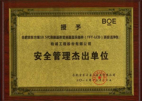 2017年12月,我司在合肥京東方第10.5代薄膜晶體管液晶顯示器件( TFT-LCD )潔凈包項(xiàng)目中喜獲”安全管理杰出單位”和”杰出承包商”稱號。