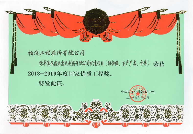 近日,我司參建的“惠氏制藥有限公司擴(kuò)建項(xiàng)目(蘇州輝瑞鉆石項(xiàng)目)”榮獲2018-2019年度“國(guó)家優(yōu)質(zhì)工程獎(jiǎng)”。