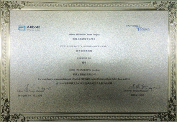 2016年9月,公司上海雅培項目部在2016年雅培研發(fā)中心項目完成中無安全損失,業(yè)主及管理方特此頒發(fā)“優(yōu)秀安全表現(xiàn)獎”以示表彰。