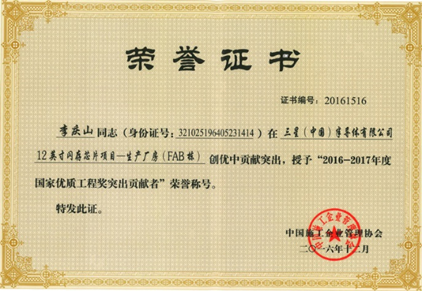 2016年12月,公司參建的三星(中國)半導體有限公司12英寸閃存芯片項目-生產(chǎn)廠房(FAB棟)榮獲“2016-2017年度國家優(yōu)質(zhì)工程獎”。